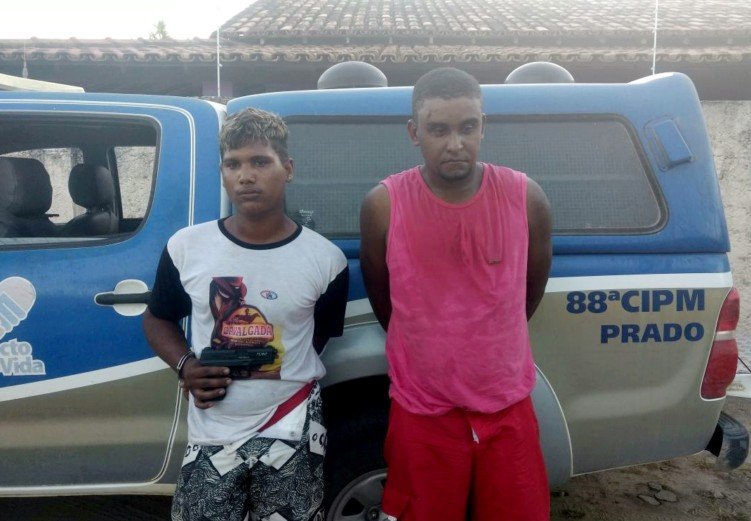 Por volta das 18 horas de domingo, (07), policiais militares lotados na 88ª CIPM / Alcobaça durante a averiguação de denúncias anônimas, dando conta da localização de uma dupla acusada de promover vários roubos a transeuntes nas Cidades de Alcobaça e Prado, prenderam em flagrante ISSAK DE AZEVEDO OLIVEIRA, 19 anos e JOÃO PAULO ALVES DOS SANTOS, 26 anos. Os suspeitos estavam a bordo de uma motocicleta Yamaha Faizer 250, cor preta, placa policial NTM 1184, licenciada em Ibirapuã – BA, onde chegaram a invadir uma vaquejada no parque de exposições na zona rural de Prado para tentar fugir da guarnição da PM, mas foram alcançados e prontamente detidos. Ambos são suspeitos de diversos roubos de celulares na região e estavam causando pânico a população, principalmente pela violência empregada e a utilização de uma réplica de uma pistola calibre 9mm, muito semelhante a uma arma de fogo de verdade.