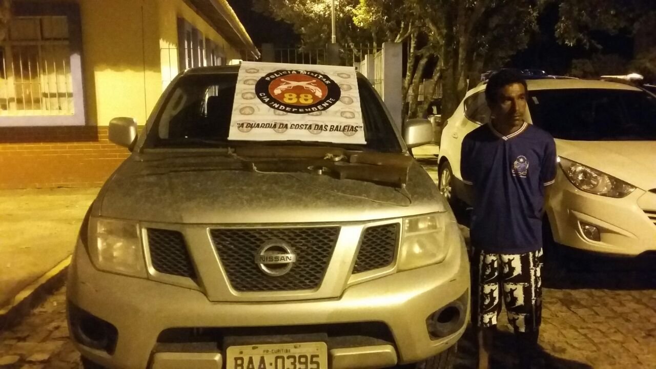 O indivíduo, que estava a bordo de um veículo Nissan/Frontier, de cor prata, placa policial BAA – 0395, licenciada na Cidade de Curitiba – PR foi abordado e em poder do mesmo foram encontradas 02 espingardas de marca e numeração suprimidas.