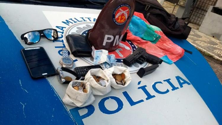 O condutor do transporte acionou a polícia militar para informar sobre o assalto. Uma guarnição da PM saiu em rondas ostensivas e conseguiram localizar o acusado, que tinha em seu poder, dinheiro e pertences das vítimas, além de um simulacro de arma de fogo tipo pistola, utilizado na ação criminosa.