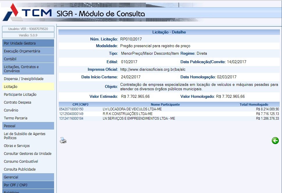 A prefeitura de Alcobaça homologou no último dia 02 de março, sob número de licitação RP010/2017, o valor de R$ 7,702.965,66 ( sete milhões setecentos e dois mil e novecentos e sessenta e cinco reais e sessenta e seis centavos), para contratação de empresa especializada em locação de veículos e máquinas pesadas para atender os diversos órgãos públicos municipais.