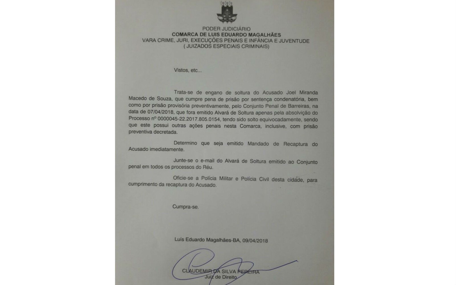 A soltura equivocada aconteceu no sábado (7), mas o caso só se tornou público na segunda-feira (9), quando o juiz criminal de Luís Eduardo, Claudemir Pereira, emitiu um alvará de recaptura, onde esclarece que o réu foi solto de forma equivocada.