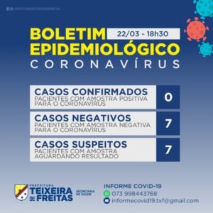 A Secretaria Municipal de Saúde de Teixeira de Freitas informa, neste domingo (22), que o município mantém em zero o número de casos confirmados pelo novo Coronavírus. Em comparação com o cenário de ontem, 21, houve um novo caso descartado, e mais um caso suspeito. O material para análise, deste último caso, será coletado nesta segunda-feira, 23.