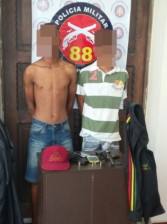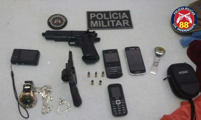 Com a dupla, os militares encontraram 01 revólver calibre .32, da marca Taurus, nº 130708; 05 munições calibre .32, sendo 02 deflagradas, 02 “picotadas” e 01 intacta; 01 simulacro de pistola, 03 aparelhos celulares; 02 relógios e 01 máquina fotográfica digital.