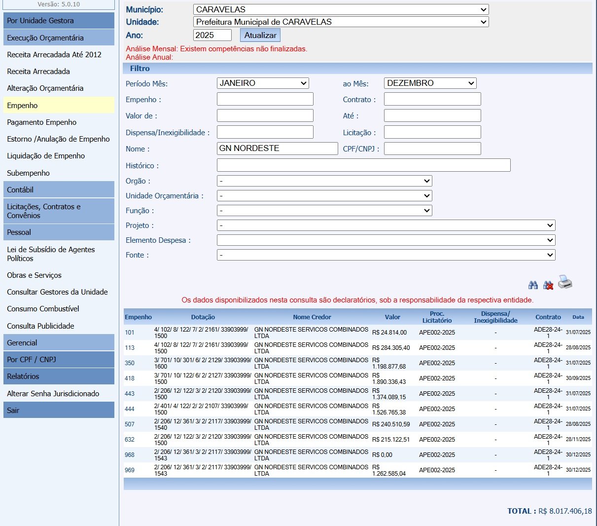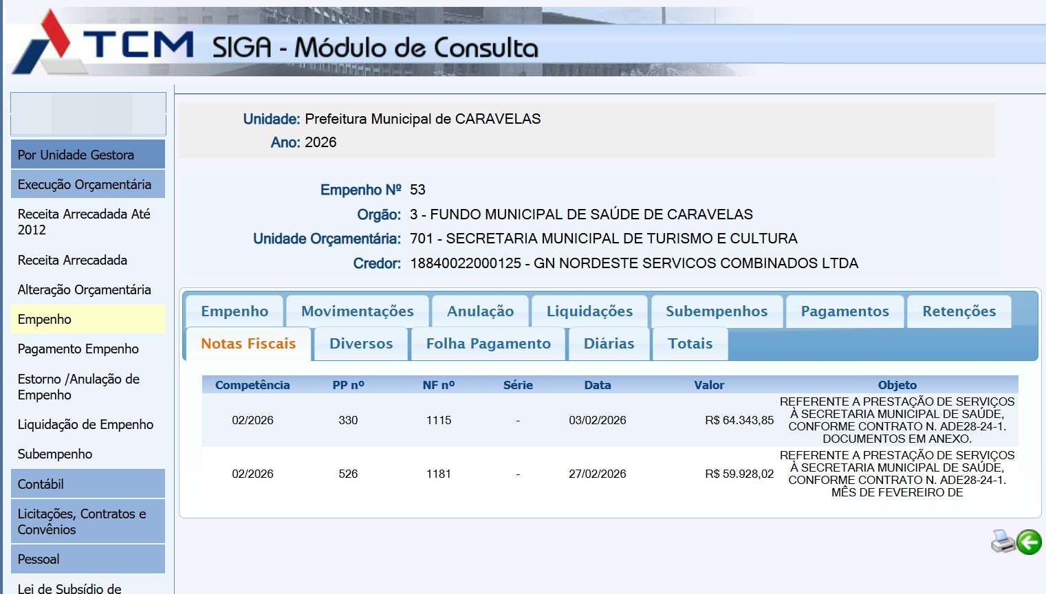 Os serviços contratados pela empresa empresa pela prefeitura de Caravelas, deixam em questão suas reais finalidades, nos empenhos encontrados no ano de 2025 e 2006, não deixam claro as obras executadas pela GN NORDESTE SERVIÇOS COMBINADOS LTDA, como constatado a seguir.