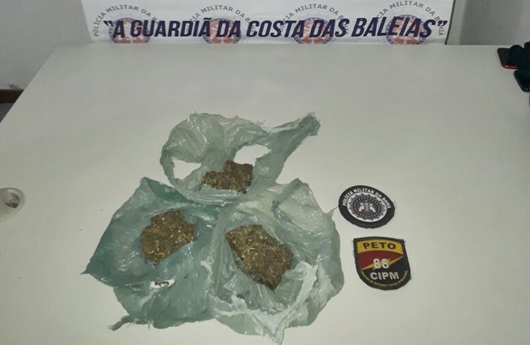Após uma abordagem, os militares encontraram em poder dos mesmos, dentro de uma pochete 03 pedaços de maconha enrolado em sacola plástica, pesando aproximadamente 148 gramas.