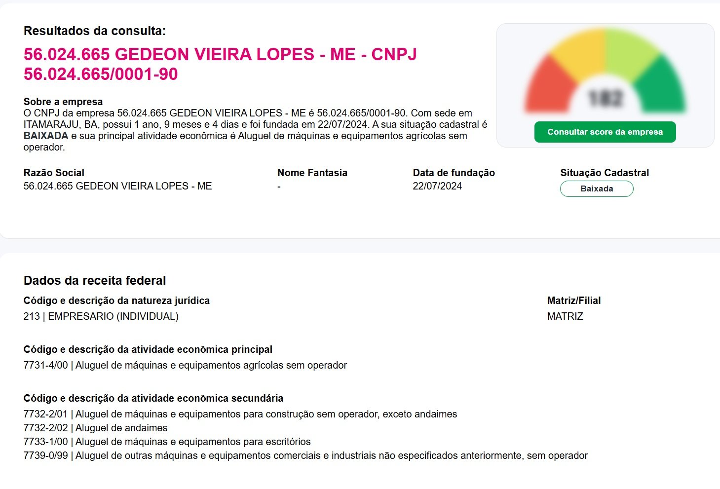 O proprietário da empresa, segundo o site da Receita Federal, GEDEON VIEIRA LOPES, constou em uma pesquisa no google como proprietário de uma empresa em seu nome, onde aparece como empresário individual, com início de atividades em 22/07/2024 e baixada no dia 24/09/2025. Nesta empresa, o CNAE são: