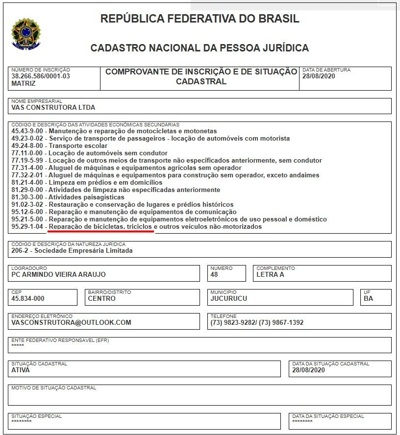 Estranhamente, no CNAE da empresa, podemos notar uma infinidade de serviços em seu CNAE segundários, entre eles, serviços de capotaria, reparação de bicicletas, tricliclos, manutenção e reparação de motocicletas, entre outros veículos não motorizados.