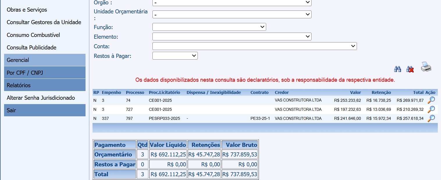 No site do TCM, ficou constatado que nos meses de janeiro e fevereiro, a empresa VAS Construtora, teve pagamentos de empenhos que totalizaram R$ 737.859,53 (setecentos e trinta e sete mil oitocentos e cinquenta e nove reais e cinquenta e três centavos.