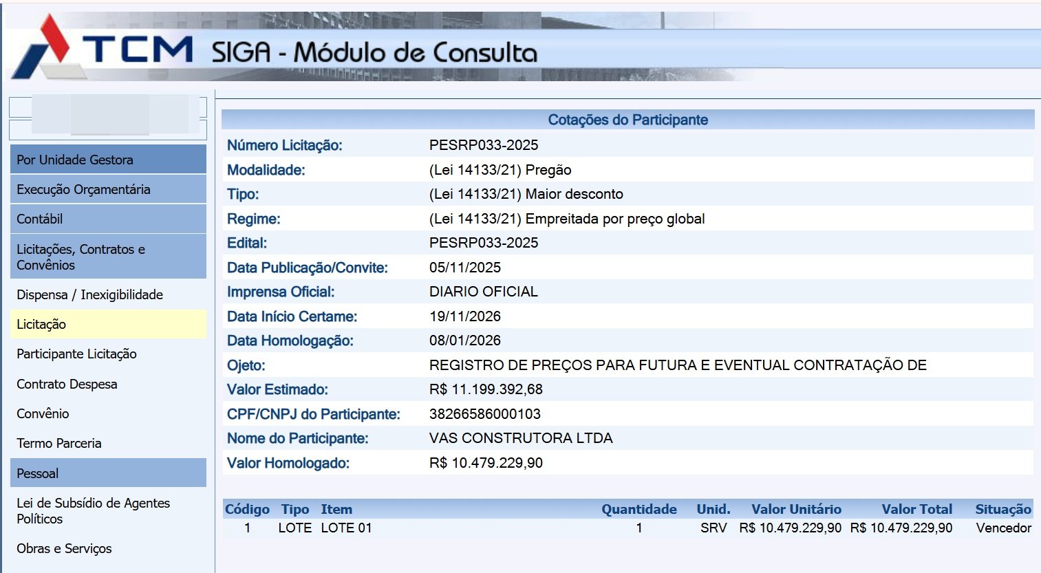 A Prefeitura Municipal de Caravelas, homologou a licitação no último dia 08 de janeiro de 2026, pelo valor de R$: 10.479.229,90 (dez milhões quatrocentos e setenta e nove mil diuzentos e vinte e nove reais e noventa centavos), em favor da empresa VAS CONSTRUTORA LTDA CNPJ: 38.266.586/0001-03, com endereço comercial à PRAÇA ARMINDO VIEIRA ARAUJO, 48, CENTRO DE JUCURUÇU, BAHIA, para CONSTRUÇÃO, AMPLIAÇÃO E REFORMA de prédios públicos.