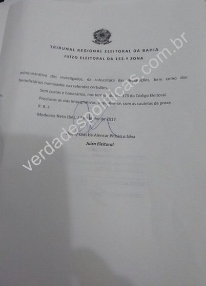 A Juíza Eleitoral Thielly Dias de Alencar, sentenciou o prefeito e seu vice a cassação do mandato e inexibilidade de 08 anos pelo crime de captação ilícita de sufrágio, (compra de votos). Na sentença, a juíza declara: