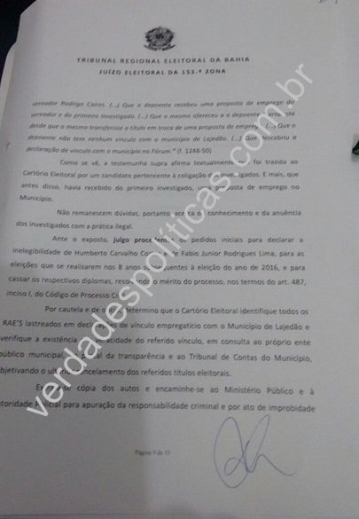 “Antes exposto, julgo procedente os pedidos iniciais para declarar a inexibilidade de Humberto Carvalho Cortês e Fábio Júnior Rodrigues Lima, para as eleições que se realizarem nos 08 anos subsequentes a eleição de 2016, e para cassar os respectivos diplomas, resolvendo o mérito do processo, nos termos do art. 487, Inciso I, do Código de processo Civil”.