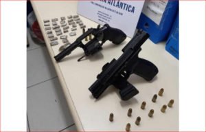 Com os dois resistentes os militares apreenderam o Fiat Palio, de cor cinza, placa OKJ-6694, uma pistola 9mm municiada com 10 cartuchos, um revólver calibre 38 da marca Taurus municiado com cinco cartuchos deflagrados e um intacto, além de R$ 7,00, um cartão bancário e porções de drogas.