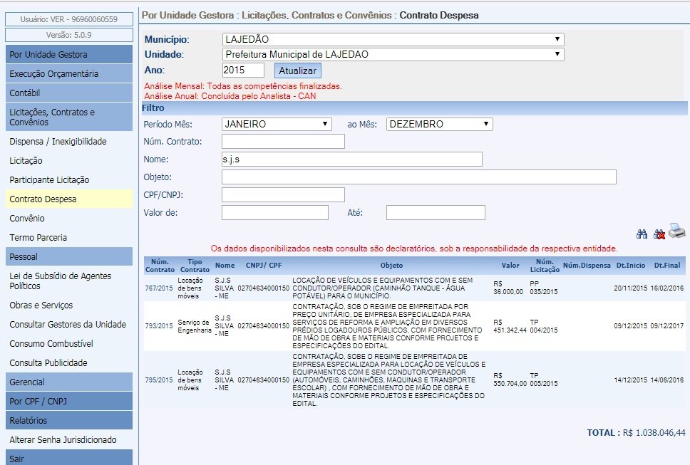A Prefeitura de Lajedão, homologou nos anos de 2015, 2016 e 2017, contrato com a empresa S.J.S. Silva Serviços Eireli – ME, CNPJ 02.704.634/0001-50, com endereço comercial a Avenida Pedro Alves Santos, s/nº, Sítio Granja Bambu, bairro Nova Teixeira de Teixeira de Freitas, para: