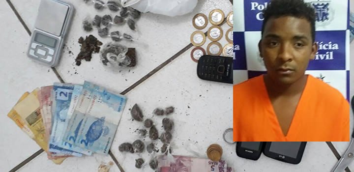 Com o acusado, forma encontrados 26 buchas de maconha; 43 pedras de crack, três aparelhos de celular e uma balança para pesar droga.