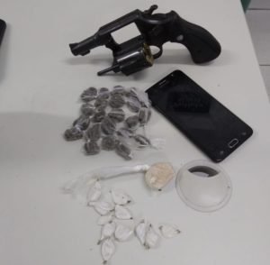 No local onde Caíque caiu a polícia encontrou uma sacola com 01 revólver cal .38, 03 munições deflagradas, 03 munições intactas, 01 Pedaço de Crack, 22 buchas de Maconha, 10 petecas de Cocaína, 01 Smartphone Samsung Preto e uma Moto Honda Pop Preta (Placa –OZJ 2839).