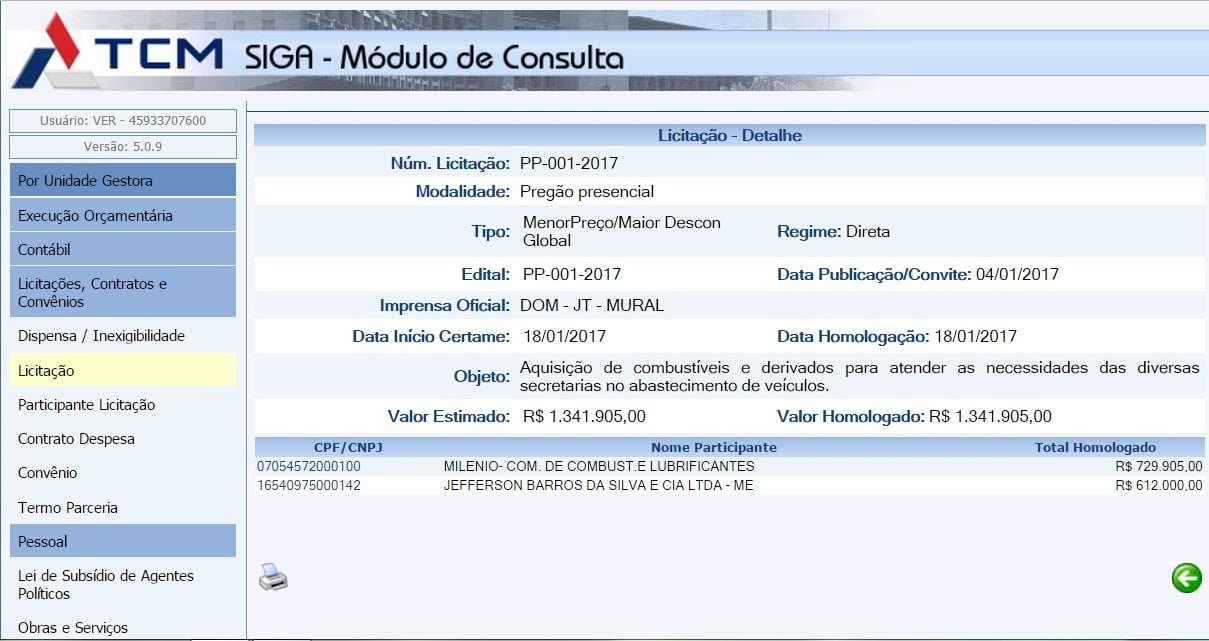 Segundo o site do Tribunal de Contas dos Municípios, ( TCM), duas empresas foram vencedoras do certame, sendo elas, MILENIO- COM. DE COMBUST.E LUBRIFICANTES, CNPJ 07.054.572/0001-00 e JEFFERSON BARROS DA SILV A E CIA LTDA – ME, CNPJ 16.540.975/0001-42.
