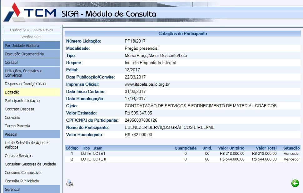 A Prefeitura de Itabela no último dia 17 de abril através de número de licitação PP18/2017, o valor de R$ 762.000,00 (setecentos e sessenta e dois mil reais) para CONTRATAÇÃO DE SERVIÇOS E FORNECIMENTO DE MATERIAL GRÁFICOS, empresa EBENEZER SERVIÇOS GRÁFICOS EIRELI-ME CNPJ 24.950.087/0001-26 com endereço a Rua Santos Dumont, 385, centro, Itabela de propriedade de Francielly Alves Barreto.