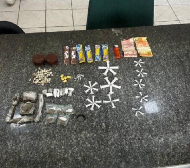 Diante da fundada suspeita, foi realizada a abordagem e, durante a busca pessoal, foram encontradas substâncias com características de entorpecentes.