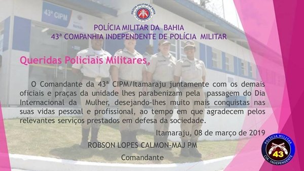 Na manhã desta quinta-feira (08), no Quartel da 43ª CIPM, em Itamaraju, policiais militares que integram o efetivo feminino da unidade receberam uma bela homenagem promovida pelo Major PM Robson Lopes Calmon, Comandante, em comemoração à passagem do Dia Internacional da Mulher.