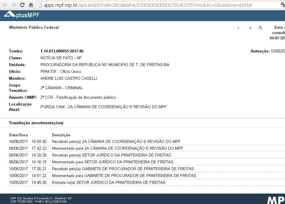 O processo de Nº 1.14.013.000055/2017-86 que tramita na Procuradoria da República no Município de Teixeira de Freitas tem com objetivo de apurar as irregularidades cometidas por Chico do Hotel, especialmente no que diz respeito à falsificação de extratos bancários da Caixa Econômica Federal onde o ex presidente tentou ocultar a emissão de cheques sem fundos da câmara, além de “maquiar” as contas bancárias para esconder supostos atos ilícitos.
