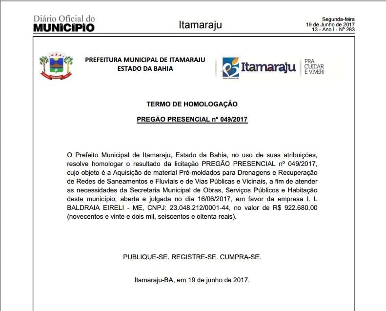 Foi homologado pelo prefeito municipal em favor da empresa I. L. BALDRAIA EIRELI – ME, CNPJ 23.048.212/0001-44, com endereço a Rua Carlos Gomes, 538, centro em Itamaraju, o pregão presencial 049/2017, o valor de R$ 922.680,00 (novecentos e vinte e dois mil e seiscentos e oitenta reais) para AQUISIÇÃO DE MATERIAL PRÉ-MOLDADOS PARA DRENAGENS E RECUPERAÇÃO DE REDES E SANEAMENTOS DE FLUVIAIS DE VIAS PÚBLICAS E VICINAIS, a fim de atender a Secretaria Municipal de Obras, Serviços Públicos e Habitação