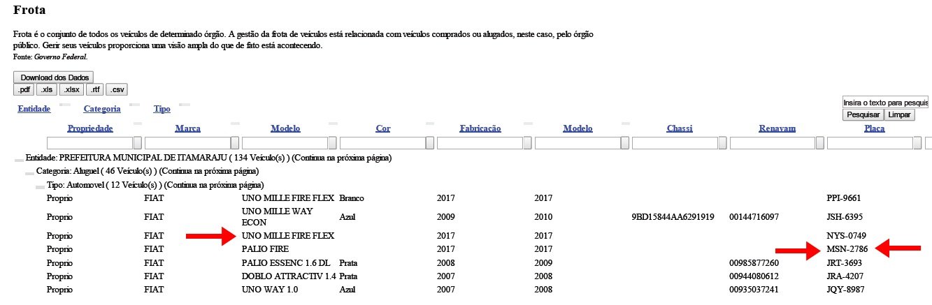 Nossa equipe, já havia registrado a imagem da página, onde as informações foram encontradas através do link: https://itamaraju-ba.portaltp.com.br/consultas/frota/veiculos.aspx