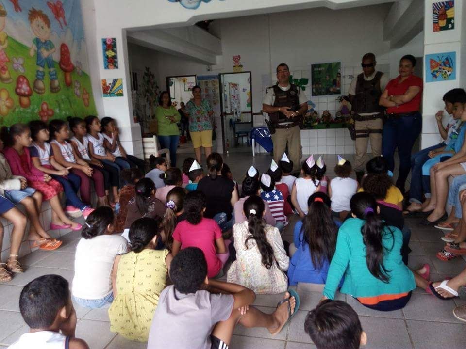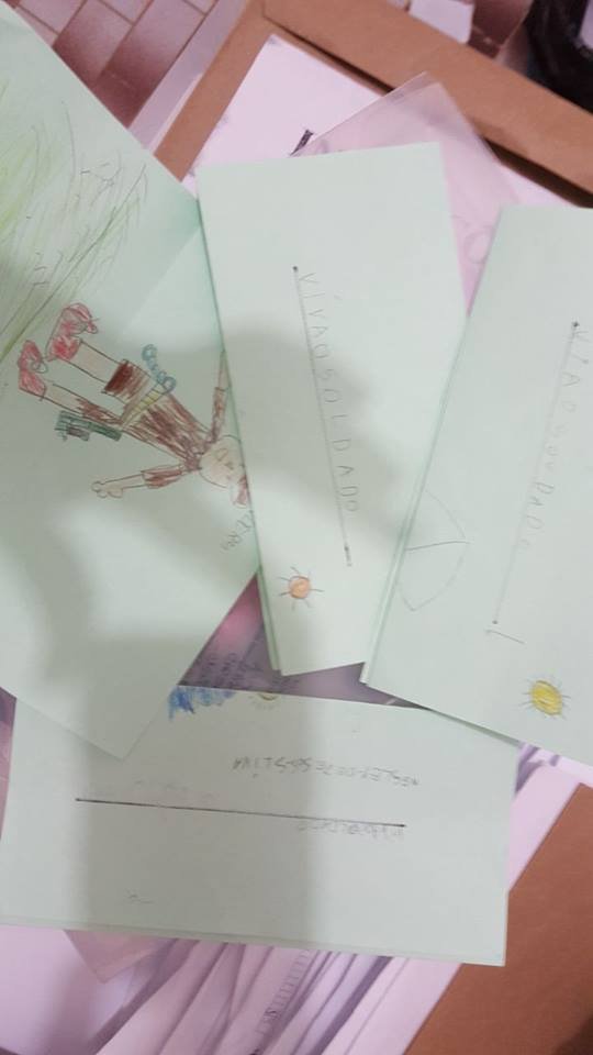 Na ocasião , os alunos cantaram músicas em homenagem aos visitantes e num gesto de carinho, gratidão e reconhecimento entregaram cartinhas e desenhos aos militares, que se emocionaram com o ato e com a acolhida dos pequeninos.