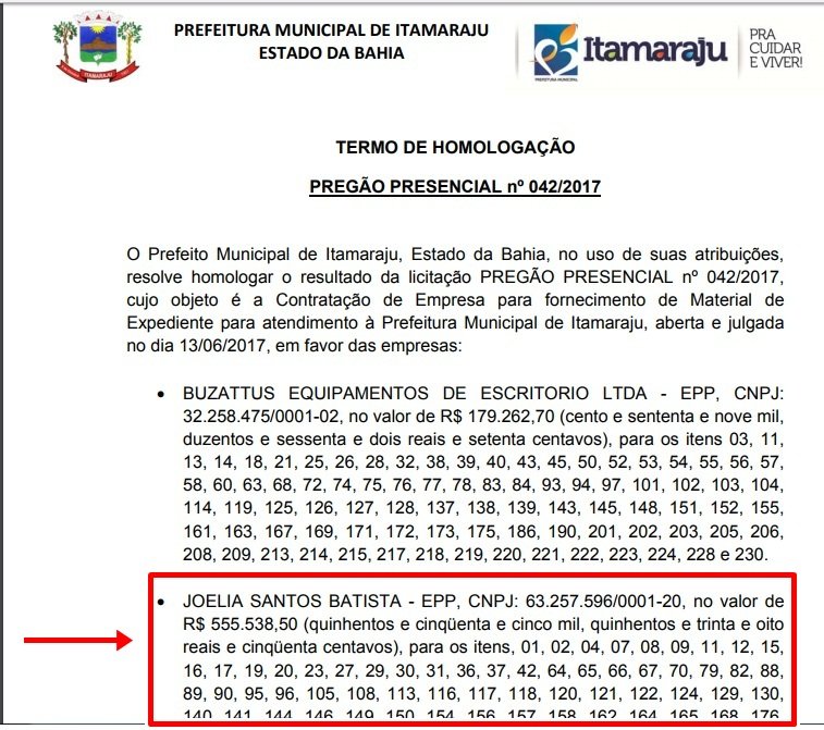 A vencedora do processo licitatório de diversos lotes, foi a empresa JOELIA SANTOS BATISTA – EPP, CNPJ: 63.257.596/0001-20, com endereço comercial na Praça Castelo Branco, 794, no centro de Itamaraju.