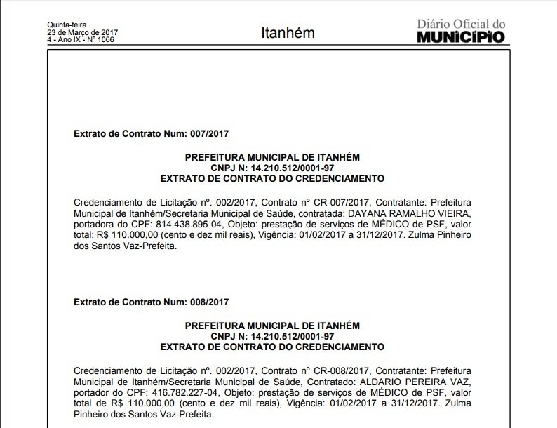 A prefeita de Itanhém, Zulma Pinheiro, através de Extrato de Contrato Num: 007/2017, publicado no Diário Oficial do Município no dia 23 de Março de 2017, contratou para vigência de 01/02 a 31/12, os médicos DAYANA RAMALHO VIEIRA e ALDÁRIO PEREIRA VAZ, com um contrato no valor de R$ 110.000,00 (cento e dez mil reais).