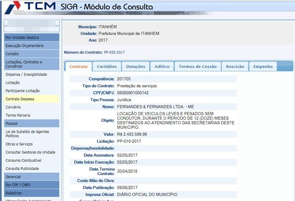 A prefeitura de Itanhém, homologou no último dia 02 de maio de 2017, a licitação nº PP-010-2017, para LOCAÇÃO DE VEÍCULOS LEVES E PESADOS SEM CONDUTOR, DURANTE O PERÍODO DE 12 (DOZE) MESES DESTINADOS AO ATENDIMENTO DAS SECRETARIAS, no valor de R$: 2.483.599,99 (dois milhões quatrocentos e oitenta e três mil quinhentos e noventa e nove reais e noventa e nove centavos).