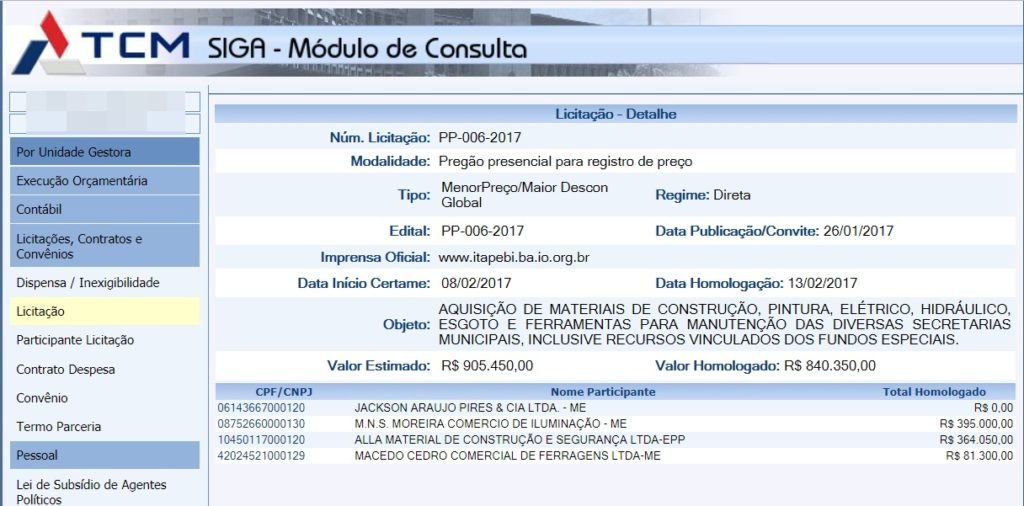 No ano de 2017, a prefeitura homologou a licitação de nº PP-006-2017, para a mesma finalidade pelo valor de R$ 840.350,00 (oitocentos e quarenta mil e trezentos e cinquenta reais).