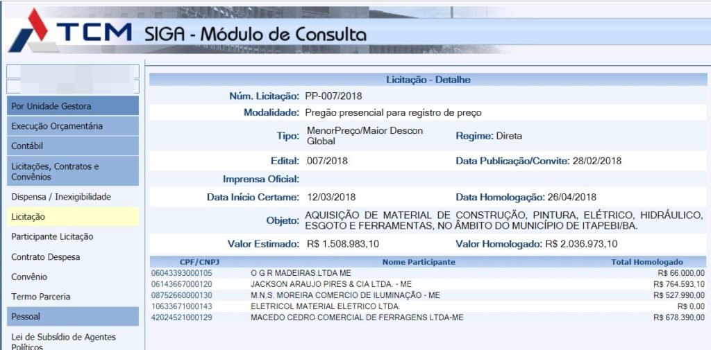 Já em 2018, a licitação para aquisição de material de construção teve um aumento de mais de 250%, sendo o Pregão presencial nº PP-007/2018, no valor de R$ 2.036,973,10 (Dois milhões trinta e seis mil novecentos e setenta e três reais e dez centavos).