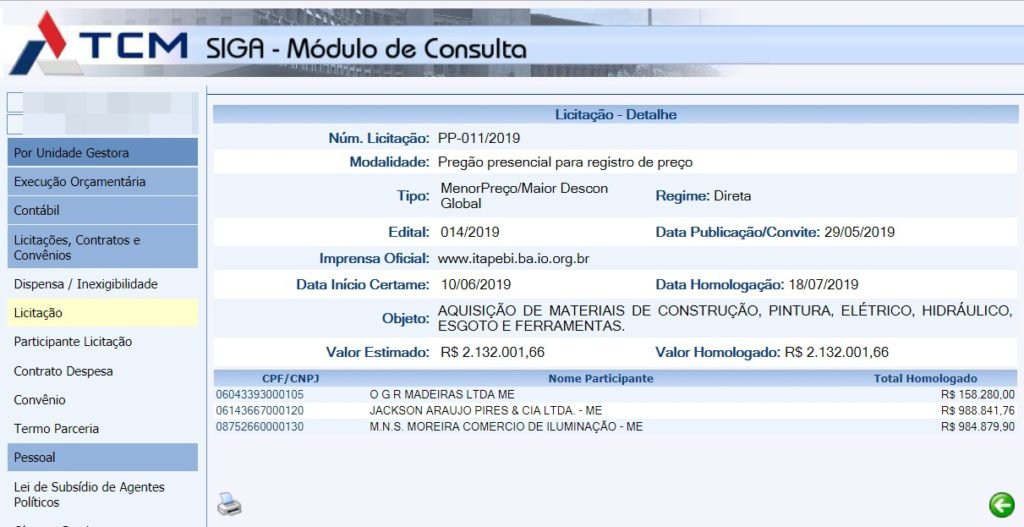 A Prefeitura de Itapebi homologou no último dia 18 de julho de 2019, a licitação nº PP-011/2019, para AQUISIÇÃO DE MATERIAIS DE CONSTRUÇÃO, PINTURA, ELÉTRICO, HIDRÁULICO, ESGOTO E FERRAMENTAS, no valor de R$ R$ 2.132.001,66 (dois milhões cento e trinta e dois mil e um real e sessenta e seis centavos).