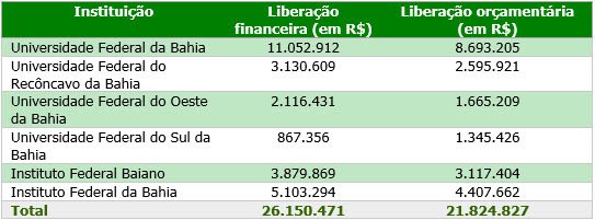 O ministro da Educação, Mendonça Filho, autorizou nesta quarta-feira (6) a liberação de R$ 47.975.298,00 para universidades e institutos federais da Bahia. De acordo com o MEC, o valor engloba o repasse financeiro para as instituições e o aumento de cinco percentuais no limite para empenho da verba destinada a custeio e investimento. Do montante, R$ 26.150.471,00 são repasses financeiros e R$ 21.824.827,00 são recursos orçamentários. “Estamos cumprindo rigorosamente com o compromisso assumido com as universidades e institutos federais, que têm tido por parte do MEC toda a atenção no sentido de garantir custeio, investimento e retomar obras paralisadas”, afirma o ministro. Os recursos destinados à Bahia integram um pacote de R$ 1 bilhão em todo o país liberado o país. Veja abaixo as quantias que cada instituição federal baiana receberá: