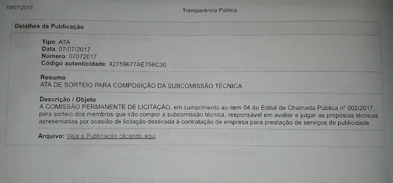 A Prefeitura de Medeiros Neto publicou no último dia 07 de julho a Ata de sorteio para composição da Subcomissão Técnica, para sorteio dos membros que irão compor a subcomissão, responsável em avaliar e julgar as propostas técnicas apresentadas por ocasião de licitação destinada a contratação de empresa para prestação de serviços de Publicidade.
