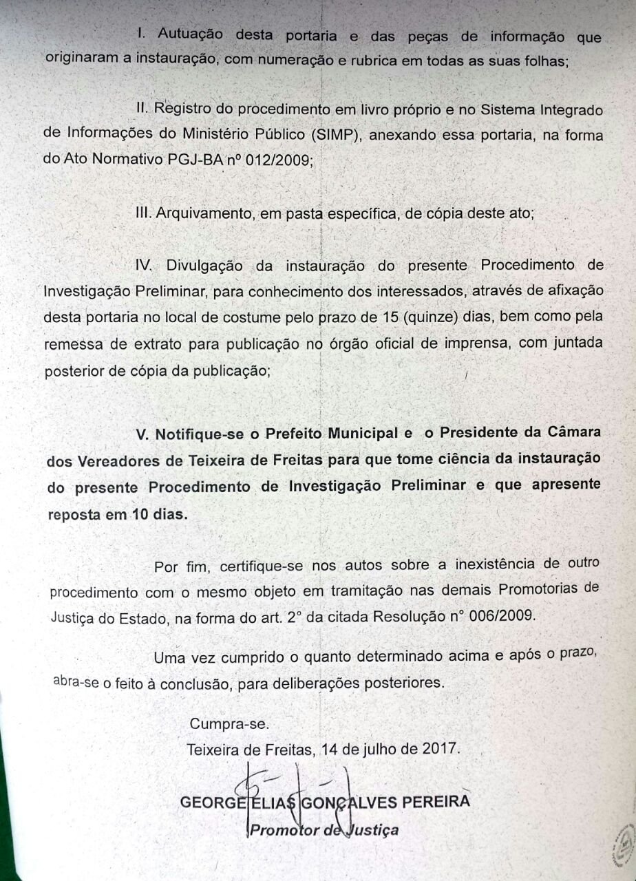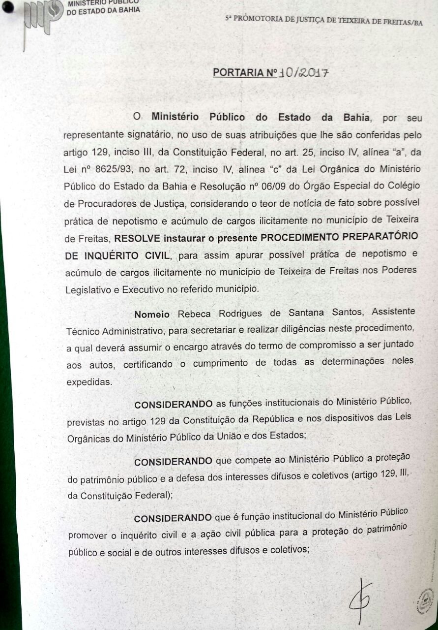 O Ministério Público do Estado da Bahia, , através do Promotor de Justiça, George Elias Gonçalves Pereira, através de Portaria nº 10/2017, instaurou PROCEDIMENTO PREPARATÓRIO DE INQUÉRITO CIVIL, para apurar prática de nepotismo e acúmulo de cargos ilicitamente no município de Teixeira de Freitas.