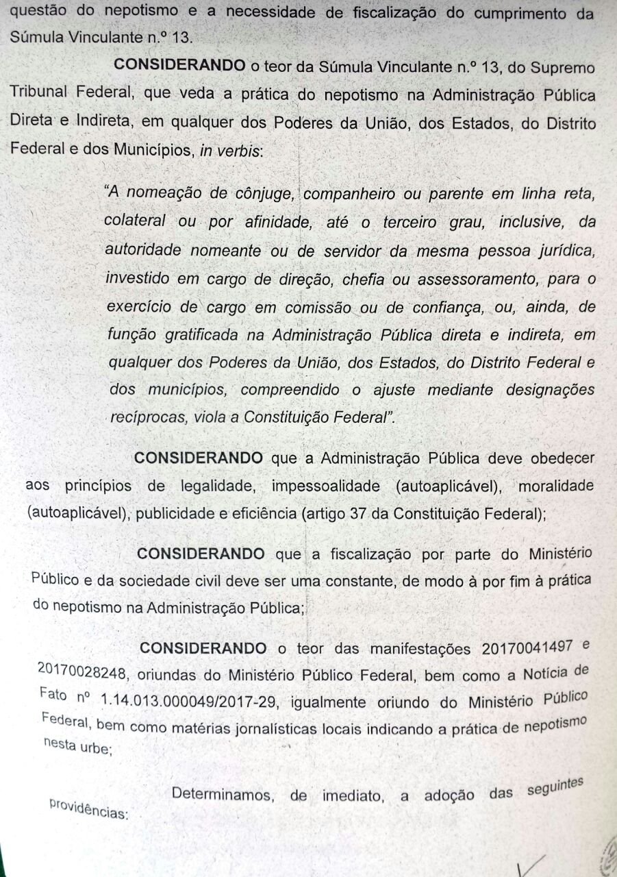 No decreto, o Ministério Público considera o teor da Súmula Vinculante nº 13, do Supremo Tribunal Federal que veda o a prática de nepotismo: