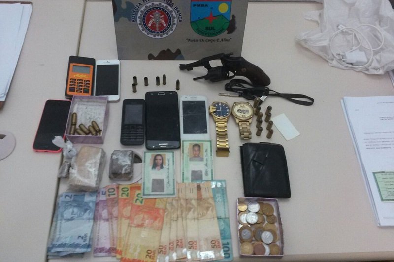 Com eles, foram apreendidos 15 munições de ponto 40, um tablete de maconha, uma máquina de cartão de crédito, dois relógios, dinheiro, cinco celulares, e duas identidades falsas.