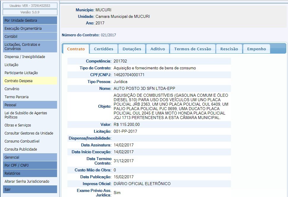 A Câmara Municipal de Vereadores de Mucuri, homologou no último dia 14 de fevereiro, sob Número do Contrato:021/2017, o valor de R$ 115.200,00 (cento e quinze mil e duzentos reais), para AQUISIÇÃO DE COMBUSTÍVEIS (GASOLINA COMUM E ÓLEO DIESEL S10) PARA USO DOS VEÍCULOS UM UNO PLACA POLICIAL JRB 2363, UM UNO PLACA POLICIAL OUL 6409, UM PALIO PLACA POLICIAL PJC 8699, UMA DUCATO PLACA POLICIAL OUL 2045 E UMA MOTO HONDA PLACA POLICIAL JQJ 1713 PERTENCENTES A ESTA CÂMARA MUNICIPAL.