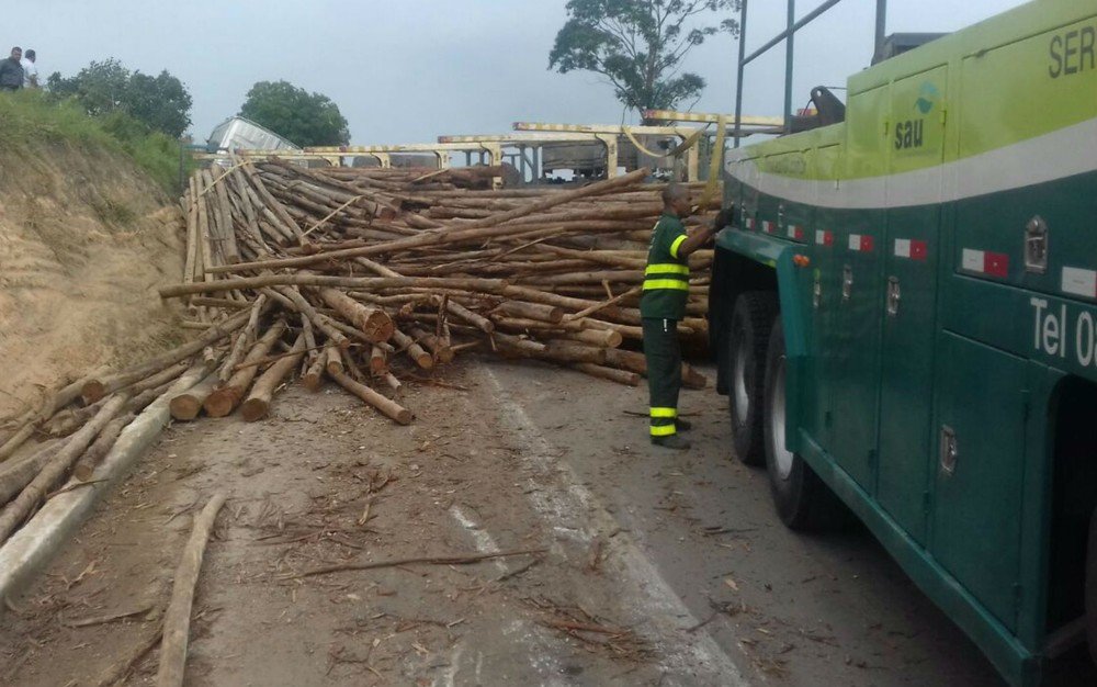 Assim que os agentes da Polícia Rodoviária Federal liberaram metade da pista após o primeiro acidente, outra carreta também carregado de eucaliptos passou por um buraco e terminou com a roda presa.