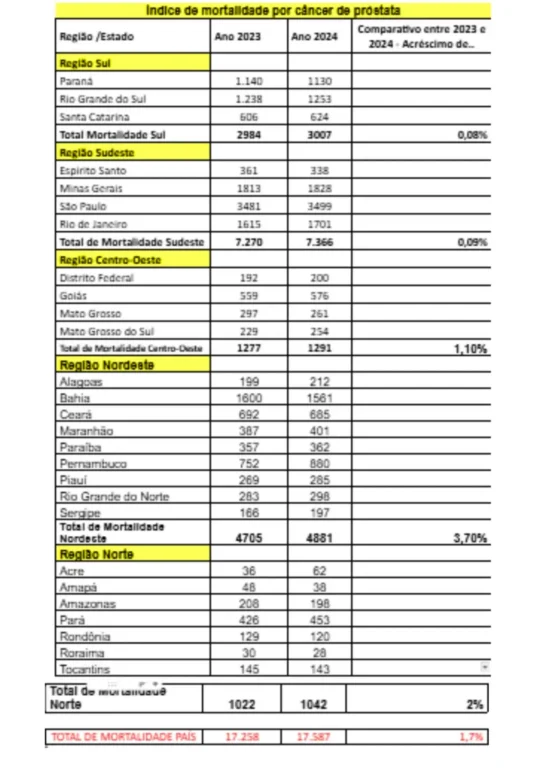 A maior incidência é esperada na região Sudeste (77,9 casos por 100 mil homens), seguida do Nordeste (73,3), Centro-Oeste (61,6), Sul (57,2) e Norte (28,4). No entanto, as taxas de mortalidade são maiores no Norte e Nordeste, demonstrando um diagnóstico mais tardio nessas regiões. Segundo dados do Instituto Nacional de Câncer (INCA), o Brasil registrou 17.258 óbitos por câncer de próstata em 2023 e 17.587 em 2024, representando um aumento de aproximadamente 2%. Bahia concentra 1.561 dos 4.881 óbitos por câncer de próstata registrados na região Nordeste em 2024. A doença é a segunda principal causa de morte entre os homens, perdendo apenas para o câncer de pulmão. Confira, a seguir, a tabela por estado.