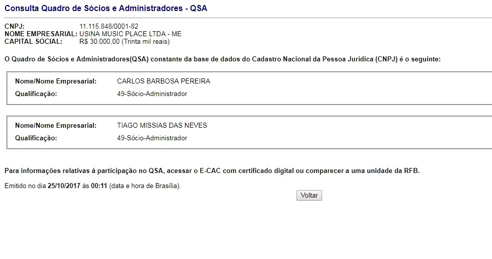 O valor elevado para gastos com eventos, chamou a atenção de nossa equipe de reportagem, que ao buscar informações sobre a empresa USINA MUSIC PLACE LTDA ME e sobre seus proprietários, identificados segundo o site da Receita Federal como CARLOS BARBOSA PEREIRA e TIAGO MISSIAS DAS NEVES, encontrou as informações abaixo discriminadas: