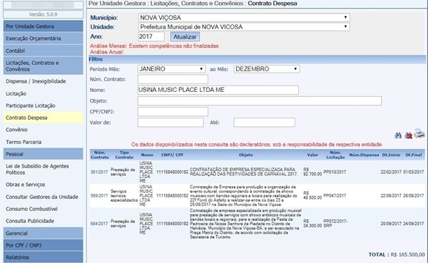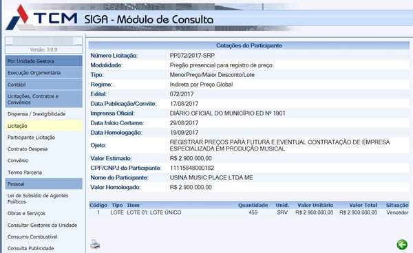 A Prefeitura de Nova Viçosa, homologou no último dia 19 de setembro, através do licitação número PP 072/2017, em favor da empresa USINA MUSIC PLACE LTDA ME, CNPJ: 11.115.848/0001-82, com sede Avenida João Felipe Calmon, nº 85, em Linhares /ES, para registrar preços para futura CONTRATAÇÃO DE EMPRESA ESPECIALIZADA EM PRODUÇÃO MUSICAL, o valor de R$ 2.900,000,00 (dois milhões novecentos mil reais).