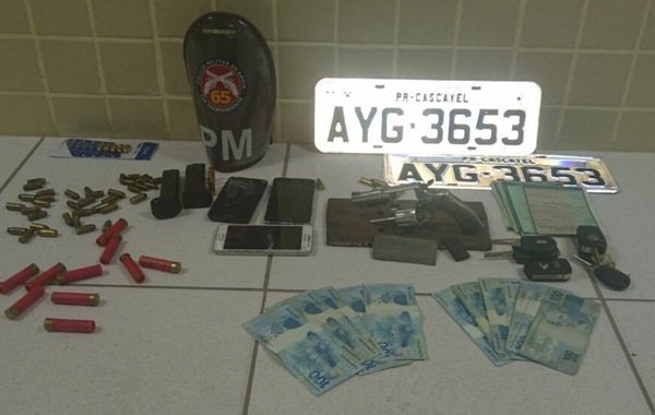 Os criminosos tinham um revolver calibre 32, uma pistola 380, munições para armas de diferentes modelos e calibres, documentos falsificados, chapas com sinais de adulteração, documentos de veículos falsificados e chaves e R$ 2 mil. O material e a quadrilha foram apresentados na Central de Flagrante.
