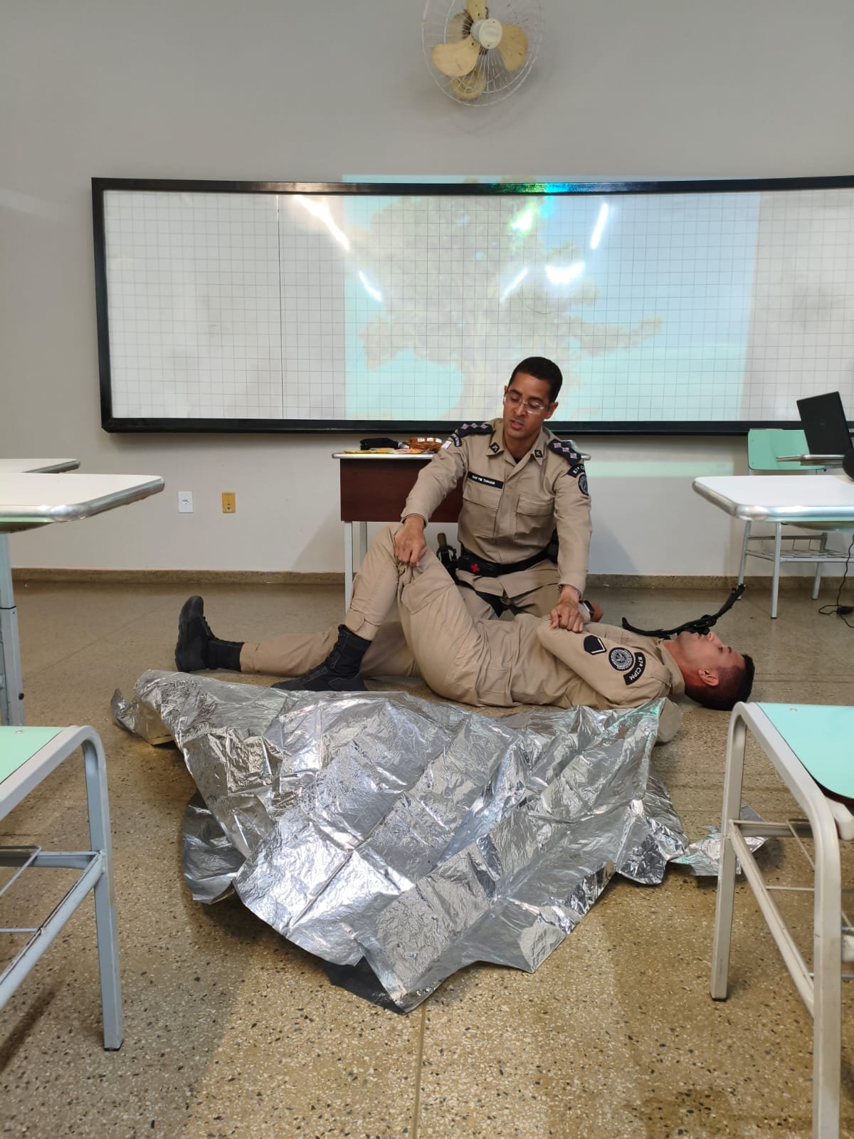 A instrução foi ministrada pelo capitão Thauan, que apresentou detalhadamente todos os materiais que compõem o kit, entre eles torniquete tático, curativos oclusivos torácicos, gazes hemostáticas e comprimidas, bandagens de compressão, aquecedores químicos e dispositivos para manejo de via aérea. O oficial, que é estudante de medicina, utilizou um projetor multimídia para explicar a função de cada item, a forma correta de utilização e a importância de cada procedimento para a preservação da vida em ambiente operacional.
