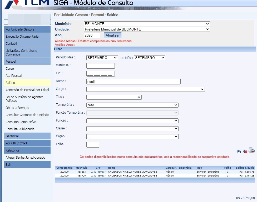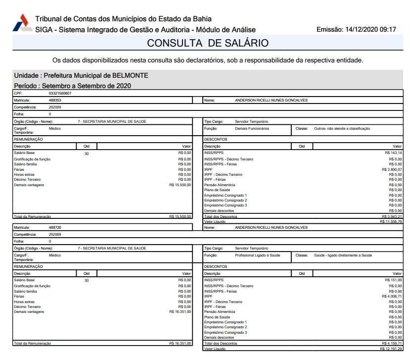 O médico Anderson Ricelli, segundo consta no TCM, (Tribunal de Contas dos municípios), recebeu seus proventos pela prefeitura de Belmonte durante todo período eletivo de 2020.
