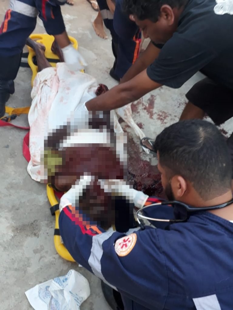 Vídeos e imagens espalhadas nas redes sociais mostram uma idosa de nome Zelita, de 80 anos, com a garanta cortada, sendo atendida por socorristas do SAMU.