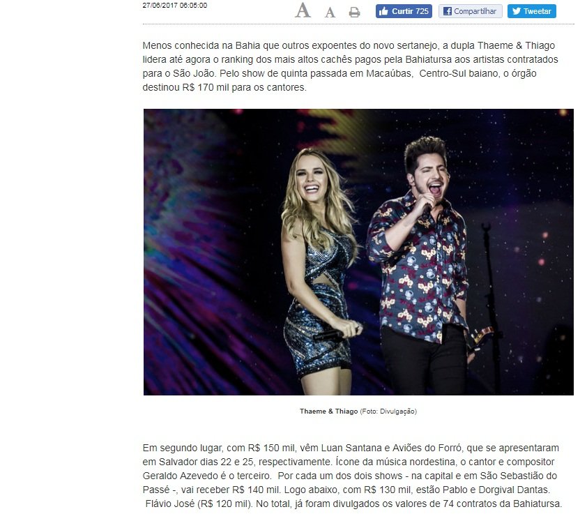 Na mesma época do ano, ainda segundo a Ação Popular, a mesma atração foi contratada pelos municípios cearenses de Assaré e Morada Nova por R$ 150 mil, metade do valor pago pela Prefeitura de Porto Seguro.