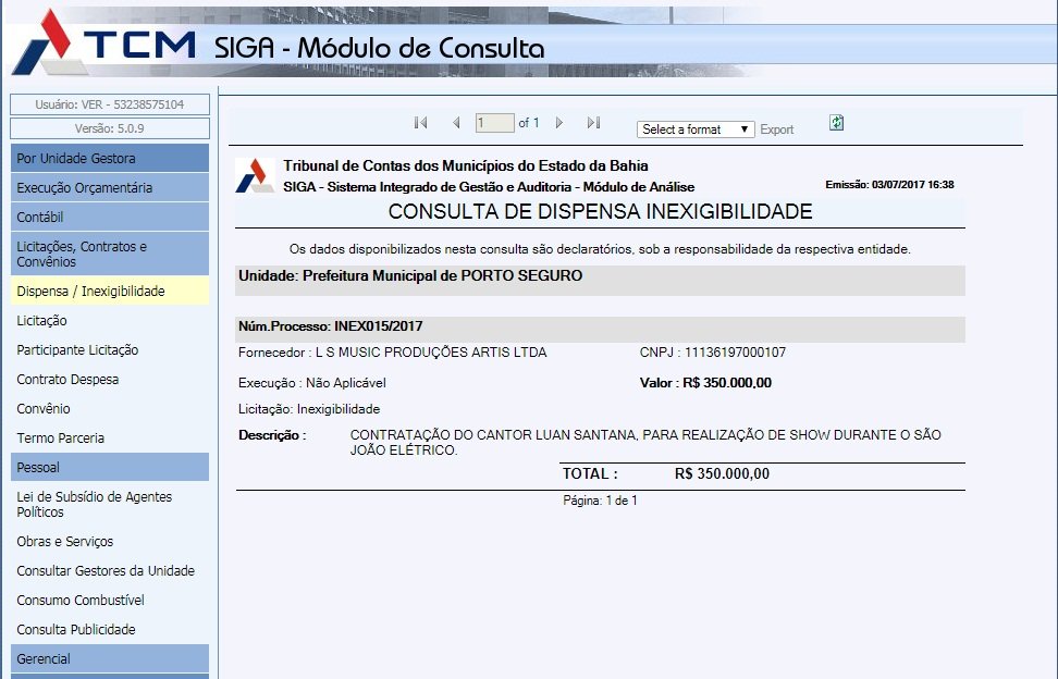 Consultando o site do TCM (Tribunal de Contas dos Municípios), ficou comprovado que a prefeitura de Porto Seguro contratou pela apresentação do cantor o valor de R$ 350.000,00 (trezentos e cinquenta mil reais), enquanto em Salvador, Luan Santana apresentou-se no mesmo dia pelo valor de R$ 150.000,00 (cento e cinquenta mil reais), conforme publicação do site Correio da Bahia, uma diferença de R$ 200.000,00 (duzentos mil reais).