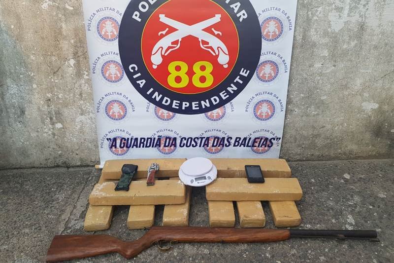 De posse da denúncia uma guarnição se deslocou até o local e lá chegando deteve o acusado. No local foi apreendido uma espingarda de fabricação caseira, 10, 220 de maconha, 01 balança de precisão e um canivete.